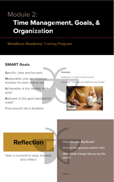 Workforce Readiness Training Creation: Jasmine created an eight-part workforce readiness training series focused on essential skills such as time management, communication, conflict resolution, technology basics, and financial literacy, helping participants build the foundational competencies needed to succeed in training and transition into employment.